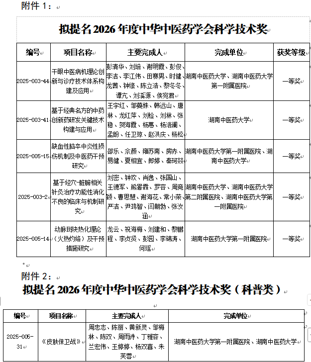 根据中华中医药学会《关于2026年度中华中医药学会科学技术奖推荐工作的通知》(中会科技发〔2026〕11号)文件要求,我会从2025年度湖南省中医药科技奖获二等奖以上项目中,择优推荐,拟提名2026年度中华中医药学会科学技术奖5项、科普类1项,科学技术奖·青年科技创新奖1项。现予以公示(学会官网:http://www.hacm.org.cn)。