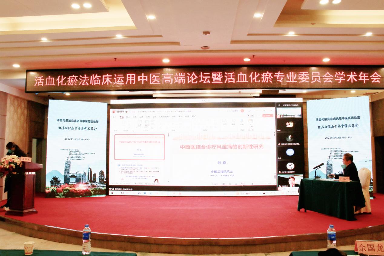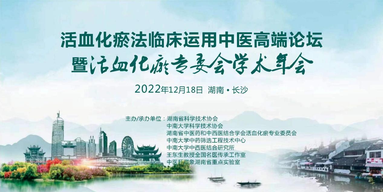 2022年12月18日,由湖南省中医药和中西医结合学会活血化瘀专业委员会主办,湖南省科学技术协会、中南大学科学技术协会、中南大学中药筛选工程技术中心、中南大学中西医结合研究所、王东生教授全国名医传承工作室、中医肝藏象湖南省重点实验室承办的“血化瘀法临床运用中医高端论坛暨活血化瘀专业委会学术年会”在长沙市以线上线下相结合的形式成功召开。本次论坛邀请来自全国的院士、知名专家齐聚一堂,就活血化瘀治法的新进展、心脑血管疾病的活血化瘀治法、中医药对血栓性疾病的预防及治疗等重大学术问题作专题学术讲座与研讨。
